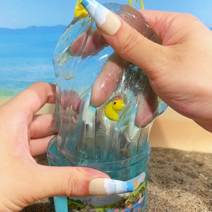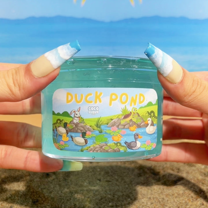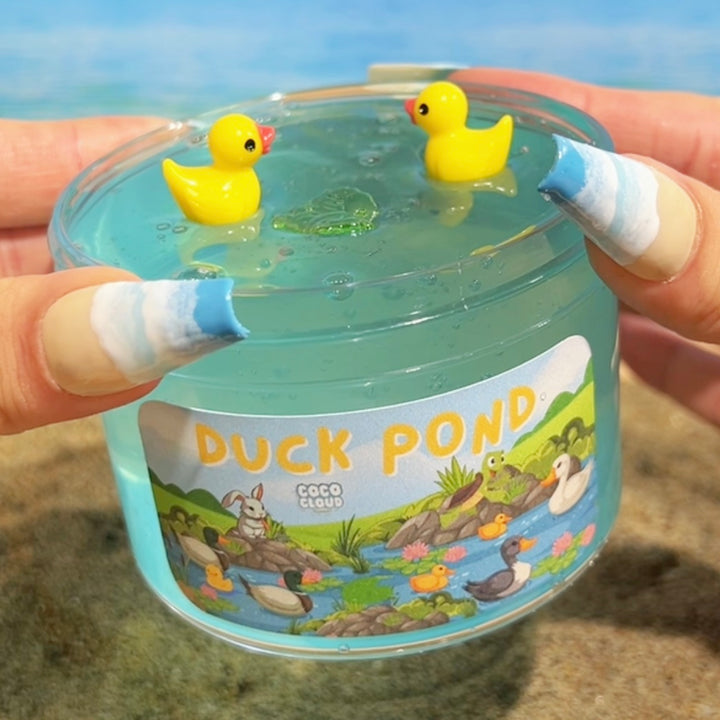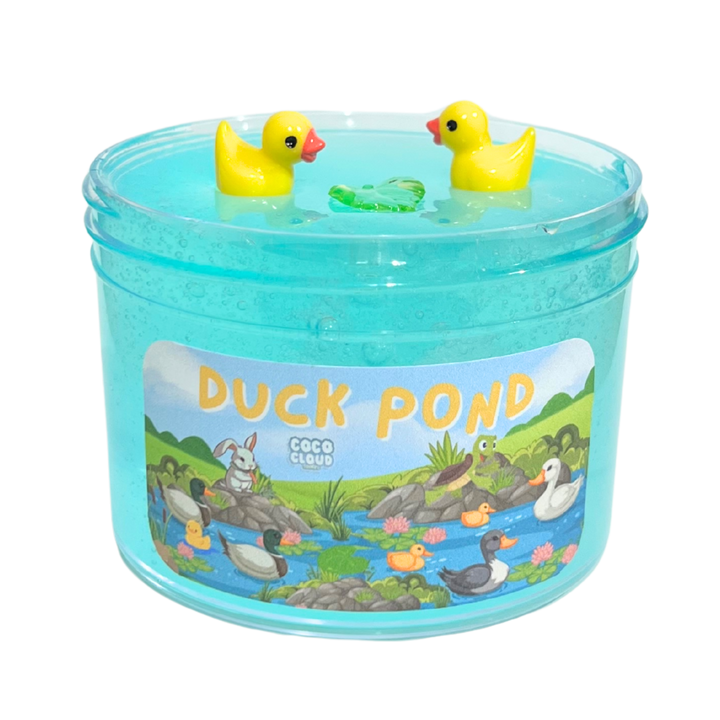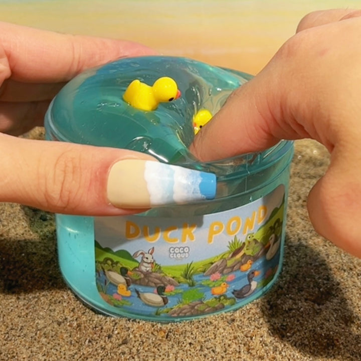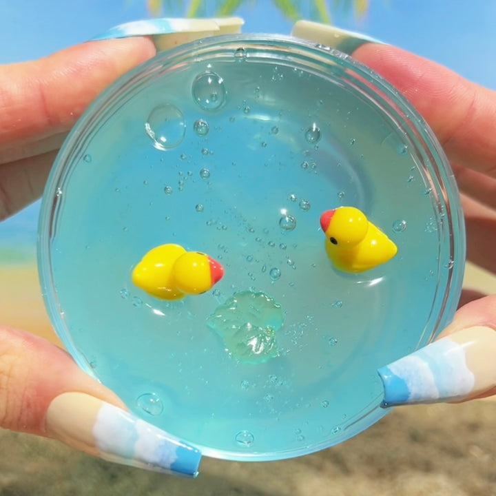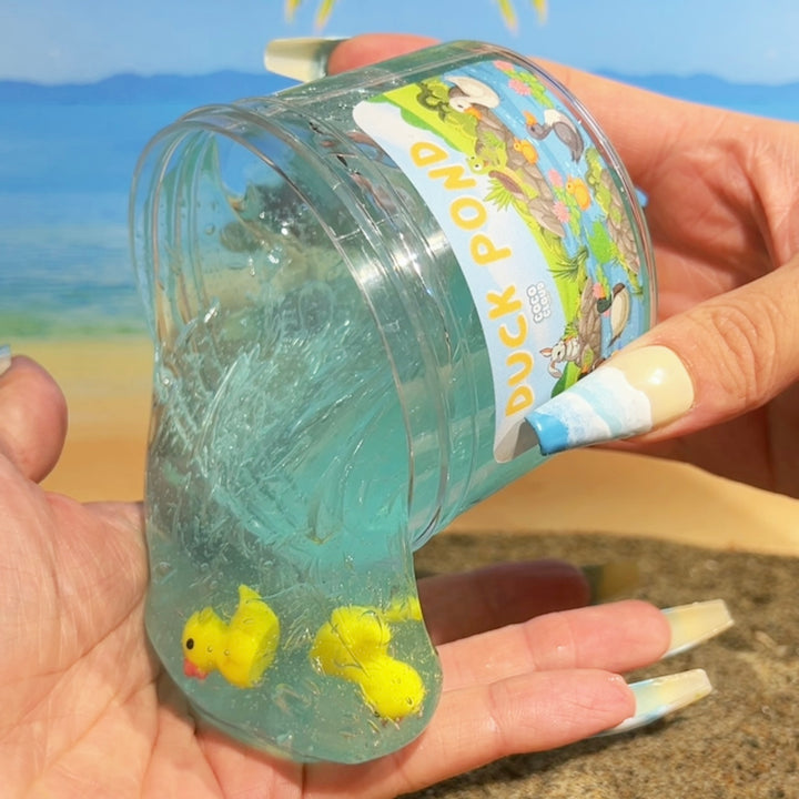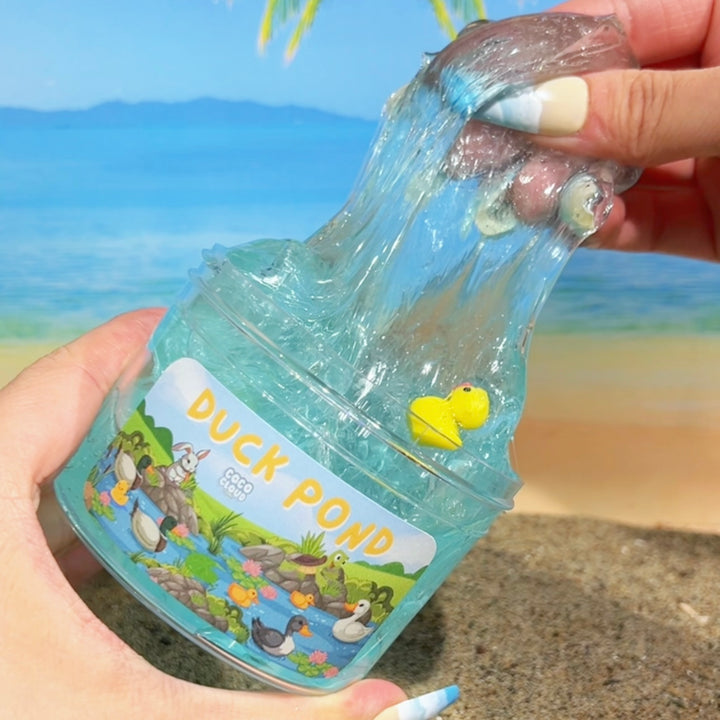 Dive into fun with Duck Pond, a crystal-clear blue slime that captures the magic of a peaceful pond. It comes with two adorable duck charms and a charming lily pad to spark your imagination. Unscented and super smooth, this slime invites endless stretching and squishing for a playful, watery adventure right in your hands!